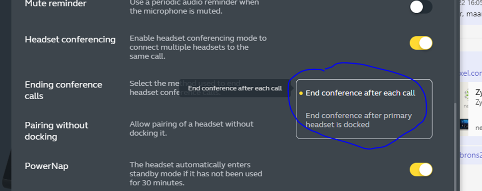 - Activeer de optie End conference after primary headset is docked (zie screenshot)